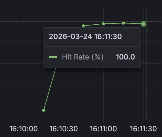 이렇게 캐싱 이슈 까지 해결해주고 부하 테스트를 진행한 결과, 캐시 히트율을 100% 달성했습니다.