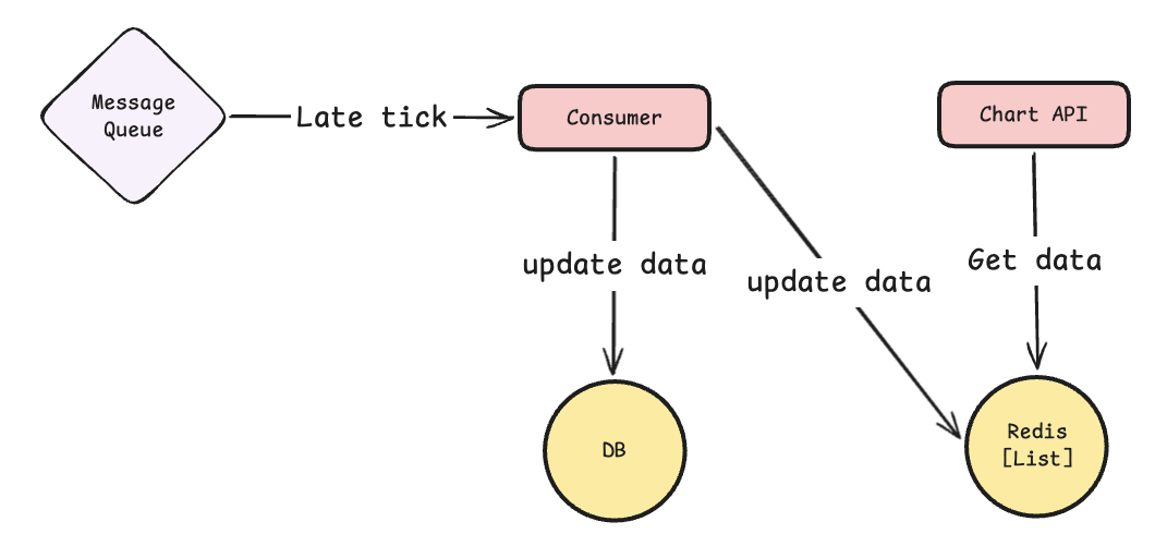Late Tick으로 인해 과거 캔들이 업데이트되어야 하는 경우, Consumer 모듈은 단순히 해당 timestamp를 Score로 하여 다시 ZADD 를 해주었습니다. 해당 과정으로 인해 기존 값을 새로운 데이터로 갱신 가능하며, 복잡한 Lock 없이도 데이터 정합성을 보장했습니다.