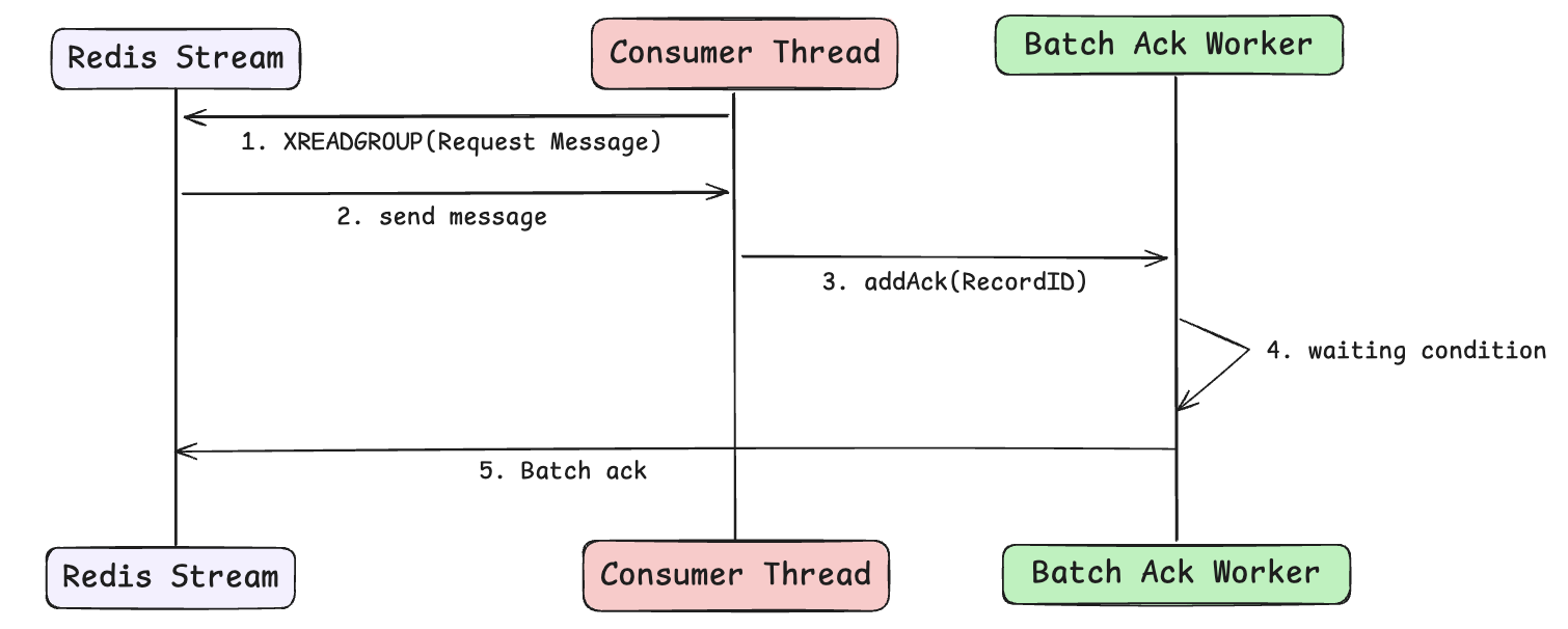 핵심 로직은 BatchAckWorker라는 전용 서비스에서 담당합니다. 처리된 메시지 ID들을 큐에 쌓아두었다가, 조건이 충족되면 Redis의 XACK 명령을 호출합니다.